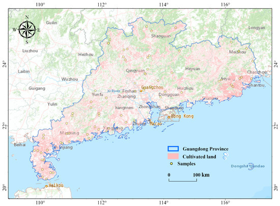 Guangdong Province is located in the southernmost part of mainland China (20°09′–25°31′ N, 109°45′–117°20′ E, Figure 1) and exhibits a subtropical monsoon climate with abundant water and climatic resources. It is subject to the combined effects of crustal movements, lithology, folding and fracture tectonics and external forces, resulting in a complex and diverse landscape with mountains, hills, plateaus and plains. The terrain is generally high in the north and low in the south, with mountains and high hills in the north and plains and tablelands in the south. Since Guangdong’s reform and opening up, urbanization and industrialization have a negative impact on the overall level of soil quality in the province, and the problem of soil pollution has become increasingly prominent. Therefore, in this study, the cultivable land in Guangdong Province was selected as the study area.
