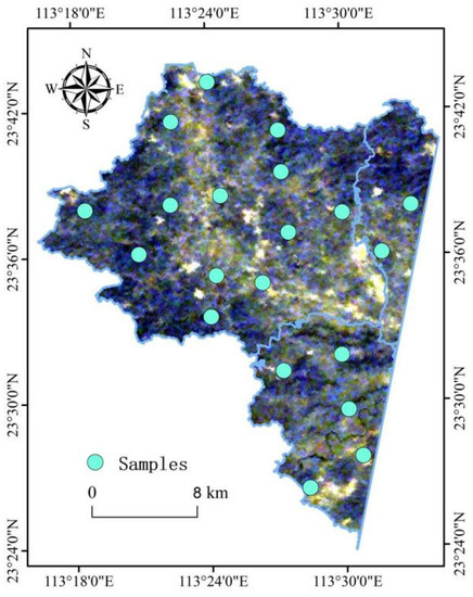 To ensure a uniform distribution of soil samples, a grid distribution method at a 50 × 50 km resolution was used to select the sampling points, with a total of 75 soil samples (Figure 1). Five points were collected in an “X” shape at the topsoil (0–20 cm) to create a mixed sample. Each sample weighed approximately 300 g. The soil samples were dried naturally, and impurities such as stones, plant stems and plastic products were removed, milled and passed through a 0.2 mm soil sieve. Each soil sample was subsequently divided into two separate samples for the chemical analysis of the soil cation content and the determination of the soil’s spectral reflectance, respectively. In addition, 20 soil samples were collected in Conghua District (Figure 2) to verify the feasibility of the model for the spatial mapping of the soil cation content at the regional scale. The soil sample collection and pre-processing procedures follow the above-described steps.