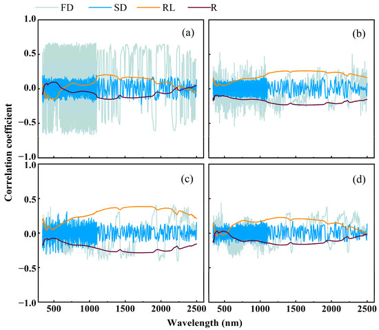 The Pearson correlation coefficient between soil cation content and spectral data was used to initially derive the spectral characteristics and sensitive bands of soil cations in order to provide a reference for the input variables of the subsequent feature screening algorithm (Figure 3). The correlation between FD and the content of the four soil cations is generally significantly higher than that of other spectral transforms (SD, RL and R). The correlation coefficient curves of the soil cations with FD and SD fluctuate sharply, while those with R and RL are relatively smooth. The curves exhibit sharp changes around 1400 nm, 2000 nm and 2200 nm. This may be attributed to the absorption features of the water molecule hydroxide groups occurring near 1400 nm and 2000 nm and the presence of clay mineral absorption features near 2200 nm.