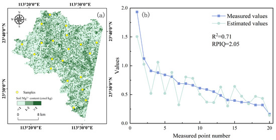 (a) Spatial distribution of soil Mg2+ content and (b) accuracy validation.
