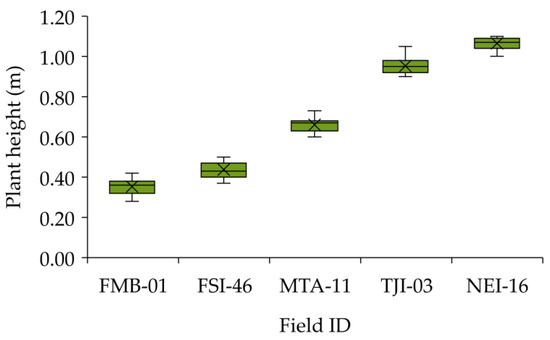 Plant height per sugarcane field. Each box was constituted by 20 values of plant height and represents one field.