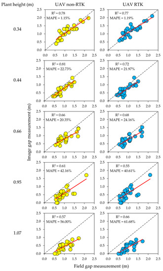 Firstly, we plotted the gap lengths measured from the images and compared them to the gaps measured in the field. This strategy allowed us to analyze the effects of image-based gap measurement as a function of plant height in the fields and under the GNSS used. We used metrics such as correlation coefficient (R2) and mean absolute percentage error (MAPE). Secondly, we compared the average image position error between RTK and non-RTK flights that was provided by the SfM software used in this study.