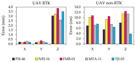 Assessing the average location errors of images is the only accuracy measure when no GCPs are used [24]. In our study, we used UAV RTK, and the results were consistent with errors in the millimeter range and little variation. However, when the non-RTK system was used, the data were highly unstable, with incredible variation in image localization. Therefore, we could conclude that using the UAV RTK would be the best option. Interestingly, both GNSSs had larger vertical errors than horizontal errors, which has also been observed in previous studies [25,26,27]. The authors suggested that this is due to possible miscalculations of the camera’s internal parameters in the autocalibration process, which would be a recurring problem for non-metric cameras [25].
