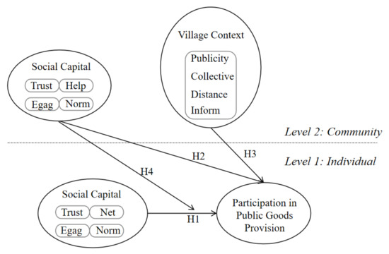 Besides the individual/household characteristics and village context, social characteristics, social networks, institutional trust, and perceptions can also be potential determinants [13,14]. Due to the characteristic of public goods—non-excludability and non-rivalry—farmers’ voluntary participation in public goods provision is subject to the classic problem of free riding, which contributes to collective dilemmas [15,16]. Social capital, conceptualized as features of social life that enable participants to act together more effectively to pursue shared objectives, provides a critical clue to override free riding problems and address collective action dilemmas [17,18]. Generally, social capital can be divided into two levels [19,20]: the individual level, which is formed around individuals and concerned with the ability of individuals to mobilize resources through social networks [21,22], and the community level, which is constructed among residents as a whole within the community [17]. By embedding farmers who pursue maximum individual interests into the social structure through social trust, networks, and norms, individual-level social capital provides an opportunity to overcome collective dilemmas. Community-level social capital constrains individuals’ perception of free riding by forming informal regulations, for example, the pressure of moral opinions, through the long-term interactions of residents within the community.