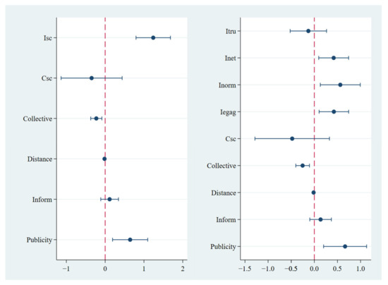 To test the reliability of HLM results, we conducted the robust test using the logit model based on Fan et al.’s (2022) [51] research. Figure 2 presents the coefficient plot of Model 2 and Model 4 using logit regression. The confidence interval of individual social capital in general, individual social networks, norms, engagement, and publicity at the community level are all above zero, which denotes a significant positive association with farmers’ participation. The confidence interval of both rural collective economy income and distance is below zero, indicating a negative effect on farmers’ participation. Therefore, the above results are consistent with the HLM results, proving our findings’ robustness.