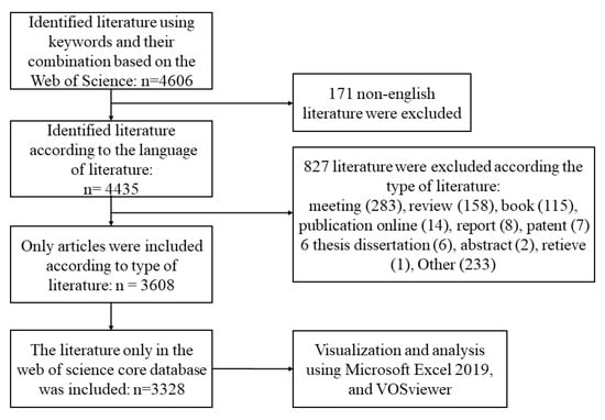 The literature was retrieved from the Web of Science Core Collection, which includes more than 12,000 influential academic journals and is widely considered an important database by global researchers. The Web of Science Core Collection is the world’s leading interdisciplinary citation database and can provide the comprehensive data information required by bibliometrics analysis [18]. More importantly, the Web of Science Core Collection covers the authoritative international academic journals that publish literature involving the agricultural SOC dynamic. The indexed keywords and their combination in the title or abstract were “soil organic carbon or soil organic matter”, “mineralization or decomposition or respiration or greenhouse gas”, “input or addition or application”, and “agriculture or cropland or farmland”. The period considered was from January 2000 to November 2022, during which agricultural SOC mineralization received attention from many researchers, and the involving studies were constantly expanding. Literature was included according to the following criteria: (1) the language was English; (2) the study had reported SOC mineralization in an agricultural ecosystem; (3) the literature type was an article; meetings, books and book chapters, online publications, reports, patents, thesis dissertations, abstracts, clinical trials, revisions, and other unspecified types of literature were excluded. A total of 3328 English articles were included from the Web of Science Core Collection and were exported as plain text files in the format of “full record and cited references” for bibliometric analysis (Figure 1).