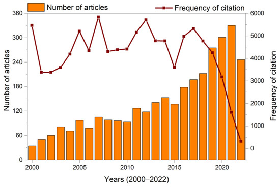 The frequency of citations per year changed to a different extent and the cumulative cited frequency was 97,002 over the last 22 years, with a maximum of 5836 (in 2007) and a minimum of 323 (in 2022) (Figure 2). The number of citations sharply decreased after 2017, although that of articles increased. The cited frequency of an article is related to its topic, the time of publication, and the influence of the journal. The decrease in citation frequency after 2017 was most likely attributed to two factors: (1) the delay in citation relative to publication and (2) an increased number of published articles during the COVID-19 pandemic between 2019–2022. These results suggest that the number of articles combined with their cited frequency can serve as a useful indicator of the development of a certain field.
