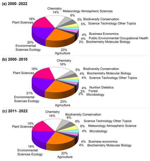 The top 10 subjects were screened and presented in Figure 3. During the selected period (2000–2022), the top three subjects were agriculture, environmental science ecology, and plant sciences, accounting for 23%, 20%, and 16% of the articles, respectively. The remaining seven subjects were chemistry, meteorology atmospheric sciences, biodiversity conservation, science technology other topics, business economics, public environmental occupational health, and biochemistry molecular biology. These results indicate that agricultural SOC mineralization has captured the attention of researchers from various disciplines and fields. Notably, the order of the subjects was not immutable. Agriculture, environmental science ecology, plant science, and chemistry were always among the top four, with the same order between subjects over the past two decades. Biochemistry molecular biology ranked 5th in the first ten years but 10th in the second ten years. Nutrition dietetics and forest only appeared from 2000 to 2010, and meteorology, atmospheric sciences, and business economics only from 2011 to 2022.