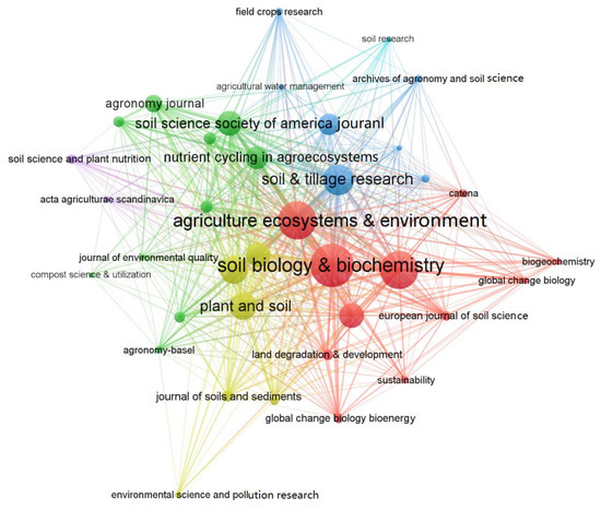Network of journals including articles involving agricultural SOC mineralization. The bigger node represents that a journal is more important. The color indicates the cluster of journals. The lines indicate the link between journals.