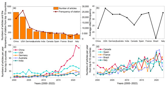 The number of articles and their cited frequency (a), the average citation frequency (b) from the top 10 countries, and the change in the number of articles per year from the top 5 and top 6–10 countries over time (c,d).