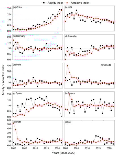 The activity and attractive indexes changed over time and across countries, ranging from 0 to 2 except the attractive index of Braza in 2000 and 2001 year and of Canada in 2000 and 2001 year (Figure 6). Among the top 10 countries, the two indexes increased continuously over time only in China, with a similar rate between the two indexes, and were greater than 1 only after the 2016. The two indexes of the other nine countries changed to a different extent over time, ranging from 0 to 1. The activity index of China, Australia, Spain, and Italy was higher than their attractive indexes in most years (more than 11 years). Conversely, the activity index of India, France, and Brazil was higher than their attractive indexes in 11 years, while that of the USA, Germany, Canada was lower than their attractive indexes only in several years (less than 11 years). Moreover, the activity index of the USA fluctuated and was greater than 1 during 2000–2004 and in 2005, 2006, 2010, and 2011. The attractive index of the USA was always greater than 1 during 2001–2018 but less than 1 during 2018–2022.