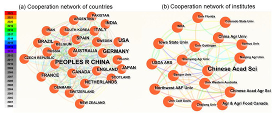 The network of institutions consisted of 195 nodes and 416 links (Figure 7b). The first principal institution was led by the Chinese Academy of Sciences, with the highest centrality (0.43) among the top 10 productive institutions. The top 10 institutions in terms of centrality were the Chinese Academy of Sciences, Agriculture & Agri-Food Canada, INRA, Colorado State University, China Agricultural University, Rothamsted Research, Bangor University, Aberdeen University, and Katholieke University Leuven. Zhejiang University ranked in the top 10 in the number of articles, but its centrality was lower than some institutes that produced more articles such as Colorado State University. The Chinese Academy of Sciences cooperated with many institutions, such as the University of California Davis and Colorado in the USA, the University of Adelaide and Queensland in Australia, the University of Paris Saclay in Paris, and Peaking University in China.