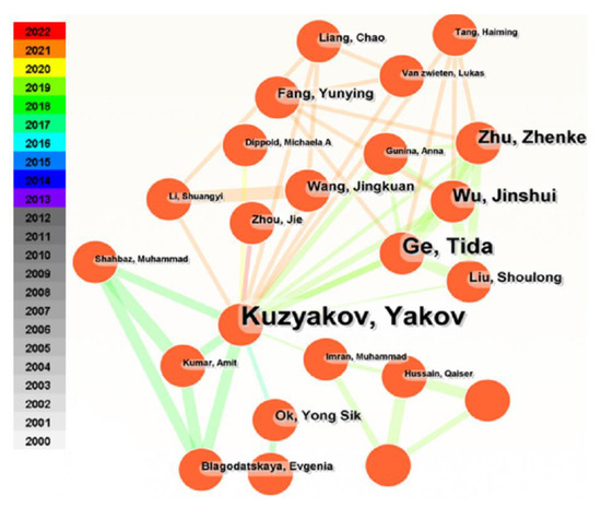 The network of authors consisted of 245 nodes and 168 collaborative links. Among the top 10 most productive authors (Table 3), Yuzyakov Yakov and Chang Scott X. ranked in the top two in terms of centrality. The main cooperation of authors was mainly after 2015 (Figure 8). Kuzyakov Yakov had the strongest cooperation relationship with 20 authors such as Gunina Anna, Blagodatskaya Evgenia, and Wu Jingshui. Their cooperating work mainly focused on the effect of cropping systems and land use and C input on SOC stock [24,25], the processes of SOC formation and transformation, and the decomposition of SOC following organic C input [10,26,27]. Both Ge Tida and Wu Jinshui cooperated with Zhu Zhenke, Guggenberger Georg, and Kuzyakov Yakov, mainly focusing on the SOC mineralization and sequestration in the paddy and the microbial and abiotic mechanisms [28,29,30]. Chang Scott X. showed no links in the network, focusing on the soil N mineralization and its relationship with SOC change and the effect of biochar amendment on SOC storage [31,32,33].