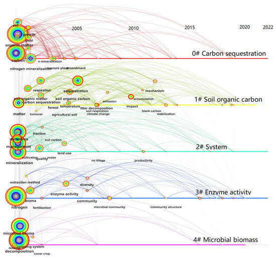 The timelines of keywords involving the study of agricultural SOC mineralization in five clusters. The size of the node reflects the co-occurrence frequencies. The links indicate the co-occurrence relationships between keywords, with a color representing a cluster of keywords. The keywords on or above straight lines listed from left to right according to time (from 2000 to 2022).