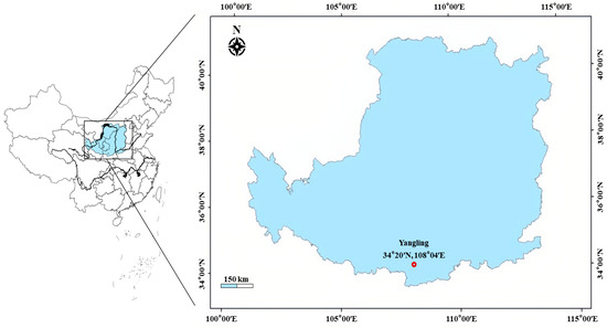 The field study was conducted in Yangling, Shaanxi (34°20′ N, 108°04′ E; altitude, 490 m) at the southern boundary of the Loess Plateau in China (Figure 1). The climate in this area is mild and semi-humid, with an average annual precipitation of 600 mm (65% of the rainfall is concentrated from June to September), an average annual evaporation of 933 mm, and an average annual temperature of 13.5 °C. The soil type is Lou soil (Eum–Orthic Anthrosol), with an average bulk density of 1.40 g cm−3. The soil texture (0–10 cm) is silty clay loam, consisting of 8% sand, 75% silt, and 17% clay [18]. At the beginning of the experiment, the basic soil properties of the 0–20 cm soil layer are shown in the Table 1. The daily meteorological data used in the test stage were acquired from the Yangling meteorological observation station located approximately 100 m from the test site.