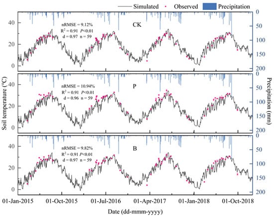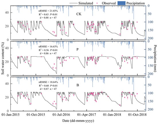 After analyzing the measured and simulated soil water contents (10 cm) under each treatment, we found significant correlations between the simulated soil water contents and the measured values for all the three treatments (p < 0.01). The simulation results ranged from medium to good (nRMSE: 16.63–21.03%, R2: 0.56–0.63, d: 0.86–0.88) (Figure 3). The field observations showed that the soil water content was slightly higher under P than B, and the soil water contents under both P and B were significantly higher than that under CK. Comparisons between the simulated and measured values showed that the model slightly underestimated the soil water content without film mulching and the soil temperature under film mulching, but overestimated the soil water content under different film mulching methods and the soil temperature without film mulching. In general, the model performed well in simulating soil water and temperature.