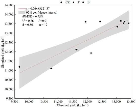 Verification of maize yields under each treatment in a four-year field experiment (n = 12). The abbreviations used in the figure are as follows: R2 refers to coefficient of determination, nRMSE indicates normalized root mean square error, and d represents Willmott index of agreement. CK refers to conventional tillage without mulching, P represents plastic film mulching with transparent polyethylene film, and B indicates biodegradable film mulching.