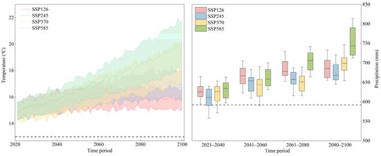 The left figure shows the mean value of the atmospheric temperature predicted by 21 GCMs under the four concentration scenarios in the future, and the shadow part represents the 95% confidence interval. The right figure shows the rainfall of each stage predicted by 21 GCMs under the four concentration scenarios in the future. Among them, the boundaries of the boxes represent the 25th and 75th percentiles, and the whiskers represent the 10th and 90th percentiles. The black line in the box represents the median, and the small square represents the average. The dashed lines indicate the average annual temperature and rainfall for the baseline period (1981–2010).