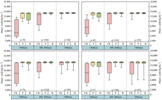 Maize yield of each treatment under different annual rainfall. The black line in the box represents the median, and the small square represents the average. The boundaries of the boxes represent the 25th and 75th percentiles, and the whiskers represent the 10th and 90th percentiles. CK—Conventional tillage without mulching. P—plastic film mulching with transparent polyethylene film, B—biodegradable film mulching.