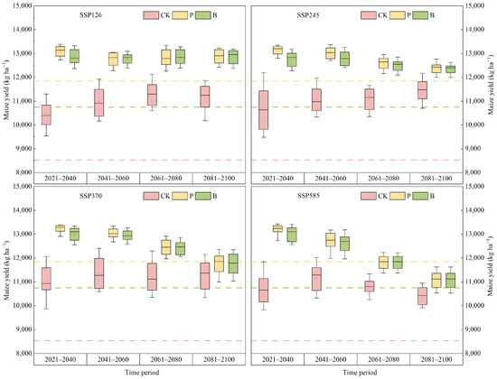 Maize yield at each stage in the future simulated under four concentration scenarios. Each box represents 21 maize yields simulated by the DNDC model using meteorological data predicted by 21 GCMs. Among them, the boundaries of the boxes represent the 25th and 75th percentiles, and the whiskers represent the 10th and 90th percentiles. The black line in the box represents the median, and the small square represents the average. The dashed line represents the maize yield of each treatment in the baseline period (1981–2010) predicted by the model. Among them, the red line, yellow line and green line represent the maize yield of CK, P and B treatments at the baseline stage, respectively. CK—Conventional tillage without mulching. P—plastic film mulching with transparent polyethylene film, B—biodegradable film mulching.