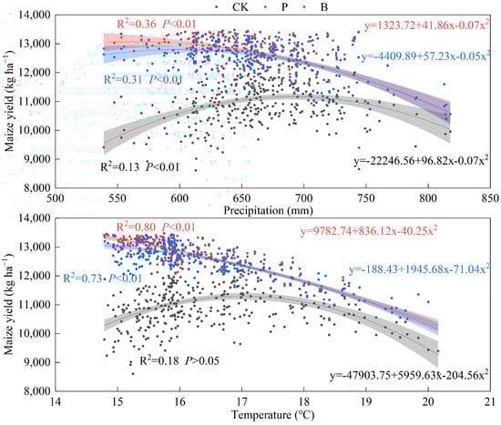 The maize yield simulated by DNDC under different temperature and precipitation years in the future stage (2021–2100). Shaded areas indicate 95% confidence intervals. CK—Conventional tillage without mulching. P—plastic film mulching with transparent polyethylene film, B—biodegradable film mulching.