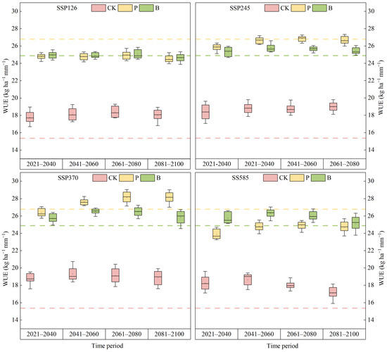 WUE at each stage simulated under four concentration scenarios in the future. Each box represents 21 WUEs simulated by the DNDC model using meteorological data predicted by 21 GCMs. Among them, the boundaries of the boxes represent the 25th and 75th percentiles, and the whiskers represent the 10th and 90th percentiles. The black line in the box represents the median, and the small square represents the average. The dashed line represents the WUE of each treatment in the baseline period (1981–2010) predicted by the model. Among them, the red line, yellow line and green line represent the maize yield of CK, P and B treatments at the baseline stage, respectively. CK—Conventional tillage without mulching. P—plastic film mulching with transparent polyethylene film, B—biodegradable film mulching.