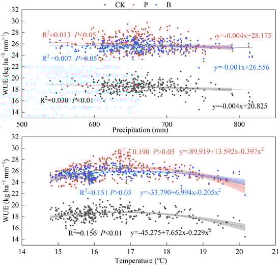 The WUE simulated by DNDC under different temperature and precipitation years in the future stage (2021–2100). Shaded areas indicate 95% confidence intervals. CK—Conventional tillage without mulching. P—plastic film mulching with transparent polyethylene film, B—biodegradable film mulching.