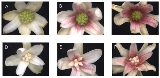 Phenotype of Schisandra chinense flower. (A–C); female flower, (D–F); male flower. (A,D); white flower (B,E); light pink flower, (C,F); dark pink flower.