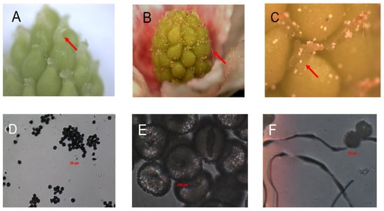 A pistil and pollen of Schisandra chinense. (A); pistil, (arrowhead) towards the stigma. (B); pistil with pollen, (arrowhead) towards pollen tube elongation. (C); stigma with pollen, (arrowhead) towards pollen. (D,E); pollen, (F); pollen tube elongation.