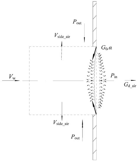 - Volumes of air sucked into the jet from both sides are equal to each other, and the volumetric densities of the outdoor and indoor air, as well as that of the air in the air curtain slit output, are assumed to be nearly identical ρin ≈ ρout ≈ ρ0;