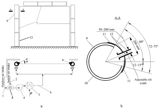 - Kuzmichev, A.; Tikhomirov, D.; Trunov, S.; Kuzmichev, I.; Lamonov, N. Modular Thermal Air Curtain for Protection of Gate Openings with Variable Vector of Air Jet Direction and Adjustable Width of Slot. Application No. 2019125012, 7 August 2019. RU Patent 2716299 C1, 11 March 2020. (In Russian). [Google Scholar]