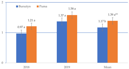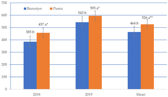 In 2019, the seed yields of both varieties were greater than in 2018 (Figure 1), as was protein yield (Figure 3). The difference in protein yield between years was significant: 158 kg ha−1 (by 41%) in Bursztyn and 138 kg ha−1 (by 30.2%) in Puma. On average, Puma protein yield was 62 kg ha−1 (13.4%) greater than Bursztyn yield.