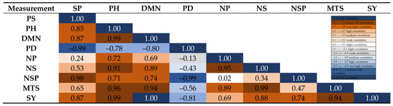 Figure 4. Correlation coefficients (r) between biometrical features, seed yield, crude protein content in the seeds and protein yield in the HiStick inoculant treatment. Specification: PH, plant height; DMN, dry mass of nodules per plant; PD, plant density; NP, number of pods per plant; NS, number of seeds per plant; NSP, number of seeds per plant pod; MTS, mass of 1000 seeds; SY, seed yield; PC, crude protein content in seeds; PY, protein yield.