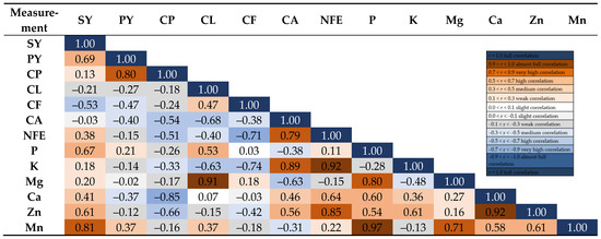 Figure 5. Correlation coefficients (r) between seed yield, protein yield and chemical composition of the yellow lupin seeds. Specification: SY, seed yield; PY, protein yield; CP, crude protein; CL, crude lipids; CF, crude fiber; CA, crude ash; NFE, N-free extract; P, phosphorus; K, potassium; Mg, magnesium; Ca, calcium; Zn, zinc; Mn, manganese.