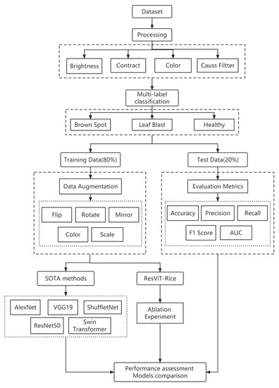 To evaluate the performance of the model, we conducted comparative experiments with traditional rice disease-detection methods and mainstream CNN models. Meanwhile, to further underscore the superiority of our ResViT block, we also carried out ablation experiments. These investigations served to underline the integral role that the ResViT block played in the overall performance of the model, thereby solidifying its place in our future efforts in the field of rice disease detection. The workflow of this study is shown in Figure 1. The results showed that ResViT-Rice obtained better accuracy in complex disease situations and can provide strong support for early warning and precise control of rice diseases. Therefore, ResViT-Rice is expected to be widely used in future rice disease detection.
