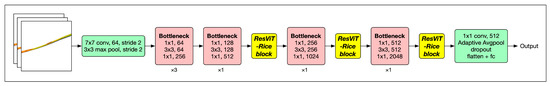 For the general ResNet [19] architecture, it used residual connections to alleviate the gradient-vanishing problem and make the network more easily trained. As the core structure of ResNet, the bottleneck is mainly composed of three convolutional layers, which were the 1 × 1 convolutional layer, 3 × 3 convolutional layer, and 1 × 1 convolutional layer, respectively. The output channels of these convolutional layers were 1/4 of the original input channel, 1/4 of the original input channel, and 4 times the original input channel, respectively. This setting allowed the bottleneck module to reduce computational complexity, increase network depth, and improve feature-extraction ability. The main idea of the bottleneck module was to introduce a bottleneck structure that mapped the input features to a low-dimensional space through a low-dimensional bottleneck layer and then mapped the features back to the original dimension through a high-dimensional expansion layer. This structure can reduce the number of parameters and computational complexity. It can also improve the feature-extraction ability, thus achieving better performance. Given the aforementioned reasons, coupled with its impressive capabilities in the visual domain, we chose ResNet as our backbone network.