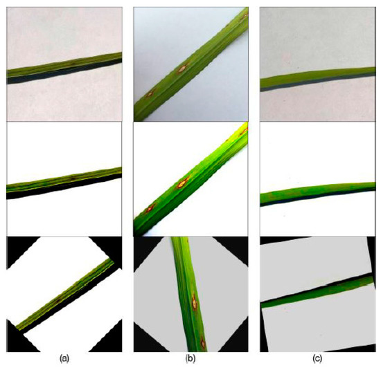 The sample images of the rice disease dataset before and after data preprocessing and augmentation: (a) brown spot, (b) leaf blast, and (c) healthy.