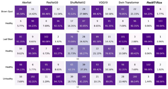 Confusion matrix of AlexNet, ResNet50, ShuffleNet, VGG19, Swin transformer, and ResViT-Rice: (a) brown spot, (b) leaf blast, and (c) healthy.