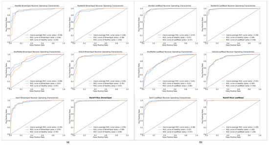 ROC curves of AlexNet, ResNet50, ShuffleNet, VGG19, Swin transformer, and ResViT-Rice: (a) brown spot and (b) leaf blast.