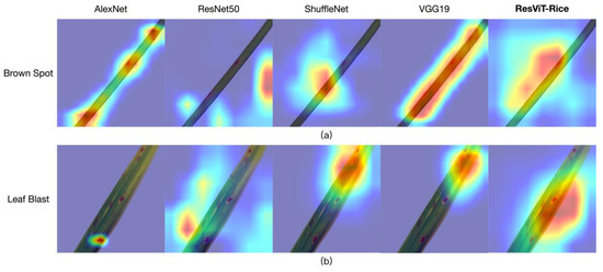 Grad-CAM heatmap of AlexNet, ResNet50, ShuffleNet, VGG19, and ResViT-Rice: (a) brown spot and (b) leaf blast.