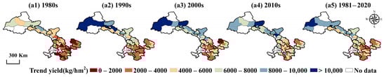 The spatial and temporal distribution of the maize trend yield tendency rate is illustrated in Figure 3a1–a5. In the 1980s, 1990s, 2000s, and 2010s, the maize trend yield tends to increase for 95.7%, 59.7%, 76.4%, and 38.9% of counties, respectively, whereas it has a significant falling trend for 1.4%, 15.3%, 8.3%, and 38.9% of counties (less than −100 kg/hm2·a). Except for six counties, the trend yields in most counties generally rises from 1981 to 2020. Most regions in Longnan City have a low trend yield increase rate of less than 60.0 kg/hm2, while most areas in Wuwei and Tianshui City have a higher increase rate (more than 120.0 kg/hm2.a).