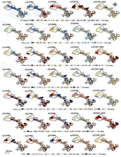 The yield variation coefficient of Gansu Province was 0.267, 0.206, 0.166, and 0.139 in the 1980s, 1990s, 2000s, and 2010s, respectively (Figure 3f1–f5). Overall, from 1981 to 2020, regions with significant variation coefficients are found in Qingyang and eastern Dingxi, indicating that their yields wildly fluctuate and are very unstable.