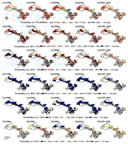 The county proportions with a probability in [0, 5%] of more than 20% are 29.0%, 27.8%, 54.2%, 40.3%, and 52.1% in the 1980s, 1990s, 2000s, 2010s, and 1981–2020, respectively (Figure 4a1–a5). The range of the counties prone to slight yield loss considerably expands after 2000. Overall, from 1981 to 2020, eleven counties have a slight yield loss probability of over 30% located in east-central Gansu, while six counties have a lower probability (less than 10%).