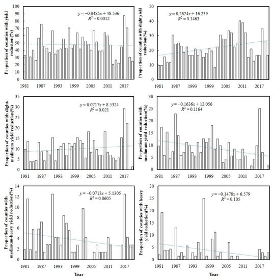 The interannual variations in the county proportions for various yield losses are depicted in Figure 5. The county proportions with medium and severe yield reduction show a significant downward trend from 1981 to 2020, whereas the proportion with slight yield reduction displays a significant upward trend. Furthermore, the fractions with slight-medium and medium-severe yield reductions individually exhibit weaker increasing and decreasing trends.