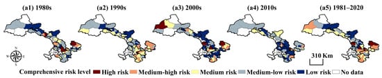 In addition, the mean values of risk indicators from 1981 to 1990, 1991 to 2000, 2001 to 2010, and 2011 to 2020 represent the interdecadal values for the 1980s, 1990s, 2000s, and 2010s, respectively. Additionally, an equal interval paired with the percentile approach is utilized for zoning, which is convenient for comparison across various decades.