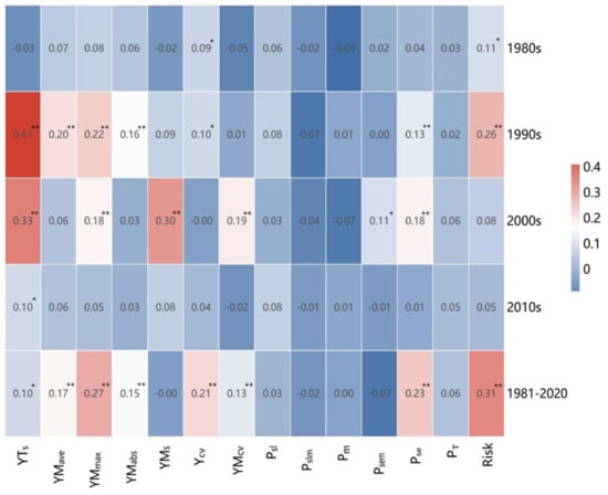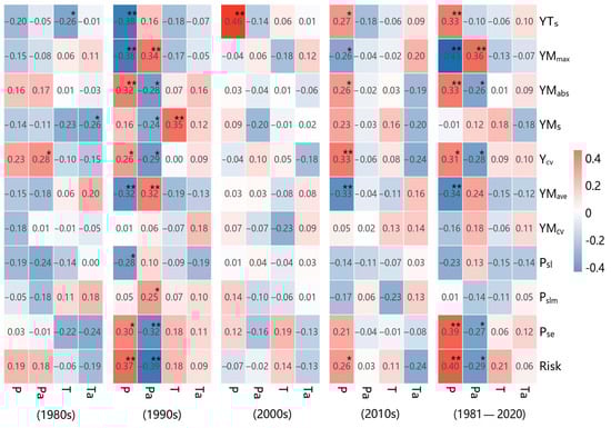The correlations between risk indicators and meteorological factors for maize production in the different decades are presented in Figure 13. As shown, annual precipitation is significantly or very significantly correlated with most risk indicators and the comprehensive risk level in the 1990s and 2010s, as well as from 1981–2020. Additionally, the effect of precipitation amounts is higher than that of precipitation fluctuations. However, rainfall positively correlates with risk, and regions with higher rainfall also have higher risks, primarily due to the region’s characteristics.