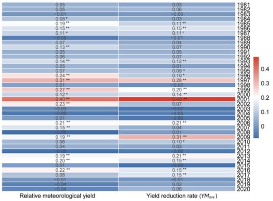 where YMave, YMabs, and YMmax are the average yield reduction rate, average fluctuation coefficient, and maximum yield reduction rate, respectively; YMcv is the variation coefficient of yield reduction; is the average yield reduction rate; and YMs is the fluctuation tendency rate of relative meteorological yield. YM is the relative meteorological yield series; YMi is the relative meteorological yield in year i; n is the number of year series; and nym is the number of years of yield decrease.