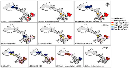 There is some spatial aggregation for most risk indicators of maize production in Gansu Province. The 1990s was a period of more robust spatial aggregation. In general, Jiuquan and its surroundings fall into the low-low risk aggregation zone, while the Qingyang region belongs to the high-high-risk aggregation area.