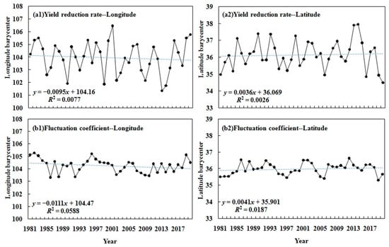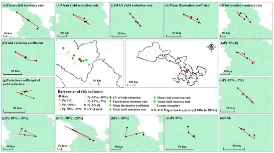 In spatial analysis, the weighted average center of a geographical element is referred to as the barycenter. Based on the coordinates and variable values of each county, the barycenter model is established, such as the barycenter model of the yield reduction rate or risk value. The barycenter migration model can graphically reflect the regional clustering, variation, and shifting patterns of risk indicators.