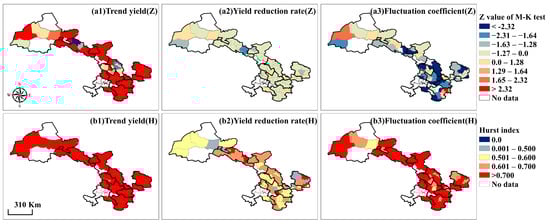 In contrast, the yield reduction rates and fluctuation coefficients show an insignificant declining trend in most counties (−1.28 < Z < 0). For the fluctuation coefficient, 47.22% and 34.72% of counties separately show significant and extremely significant decreasing trends, while 22.2% of counties show an increasing trend, and only two counties show a significant increasing trend.
